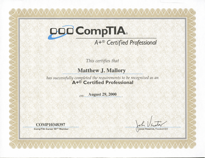 - Brainbench - Computer Technician, Master Computer PC Essentials User, Master Computer Fundamentals Windows XP, Master Computer Fundamentals Windows 95/98 and HTML 3.2